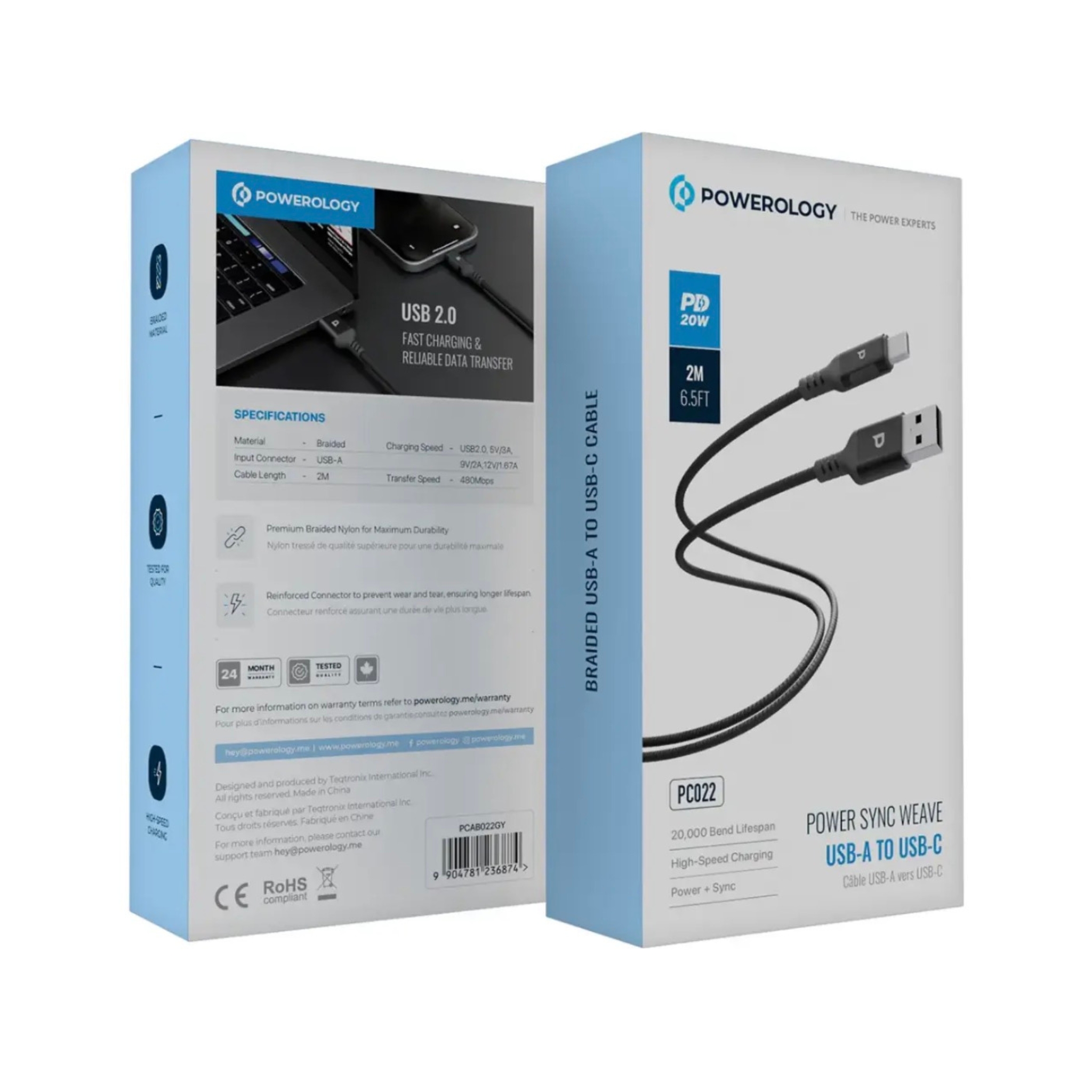محول طاقة Powerology Power Sync Weave من USB-A إلى USB-C بتقنية الشحن السريع PD بقدرة 20 واط – رمادي مترين